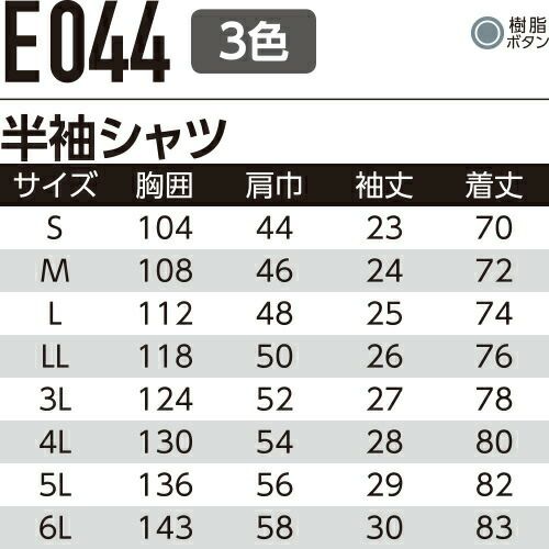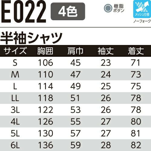 他の画像を見る 作業服 半袖シャツ Asahicho 旭蝶繊維 半袖シャツ E6903 作業着 春夏作業着 作業服 半袖 春夏 特別価格 ¥ 4,070 税込 〜 特別価格 ¥ 税込 ソフト加工×光触媒防汚加工 セーフティウェア(E7902シリーズ 反射材付き)とコーディネート可能です。 詳細を見る お気に入りに登録する
