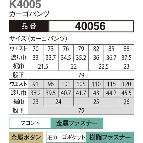 他の画像を見る 作業服 カーゴパンツ 大川被服 kansai uniform カンサイユニフォーム K4005 40056 作業着 春夏 特別価格 ¥ 5,880 税込 〜 特別価格 ¥ 税込 時代に流されない、本物志向のユニフォーム。 本物に勝るコピーは無い!時代とともに移り変わる流行中には2・3年で姿を消すユニフォームもある10年後に振り返って「着てよかった」と思える服次の10年に向かって最新の型紙を採用しております生地は透けて見える清涼感を持ちながら、高い洗濯性を誇ります(クラレトレーディング・日本製素材使用) 在庫切れ 詳細を見る お気に入りに登録する