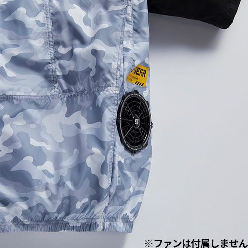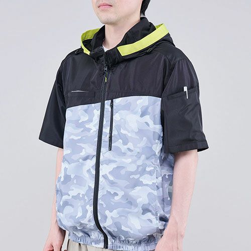 大胆な切替をデザインコアにしたスポーティスタイルと実用性を高める両脇ファン(サイドファン)配置と大型フードを融合させ、ワークスペックながらデイリーシーンでも活躍できるスタイリッシュフーディ ●デザインアクセントになる着脱可能な大型フード●肌ダメージを軽減する遮熱、UVカット(UPF50+)●熱中症対策に配慮した実用的な3ヵ所の保冷剤ポケット