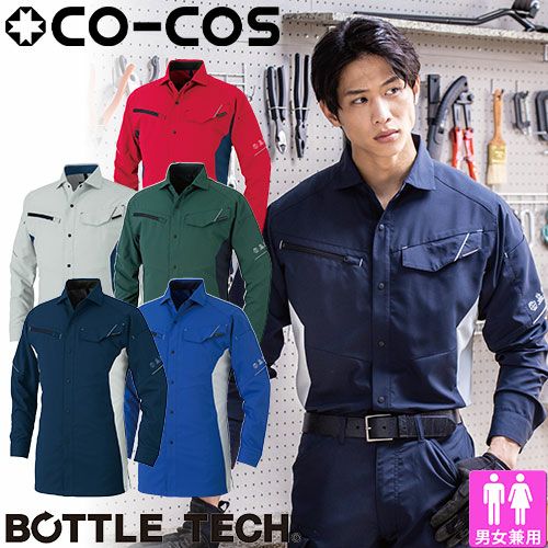 作業服 長袖シャツ コーコス信岡 CO-COS BOTTLE TECH エコストレッチ長袖シャツ AE-8098 作業着 春夏 エコマーク 再生ペットボトル SDGs カーボンオフセット UVカット 帯電防止 男女兼用