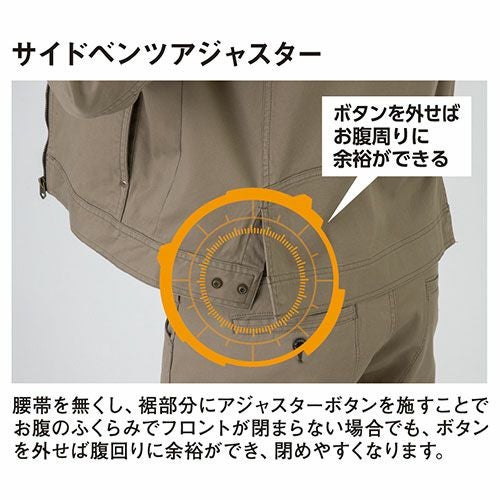 再生PET素材100%のワークウェア企業のSDGsへの取り組み、環境活動への寄与が無理なくできます。上着両脇のダイヤカット配色がセットアップ時にスタイルアップ効果を発揮します。 ■カーボンオフセットによるCO2削減製品1枚あたり5KgのCO2削減に貢献■サイドベンツアジャスター腰帯を無くし裾部分にアジャスターボタンを施すことでお腹のふくらみでフロントが閉まらない場合でもボタンを外せば腰回りに余裕ができ閉めやすくなります。■UVカット紫外線による日焼けから肌をガード(UPF50+、紫外線遮断率98%)