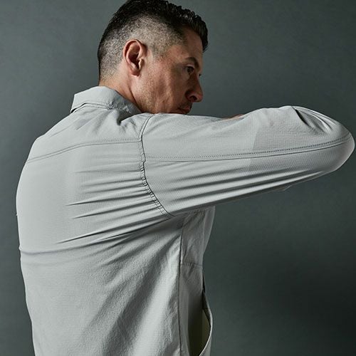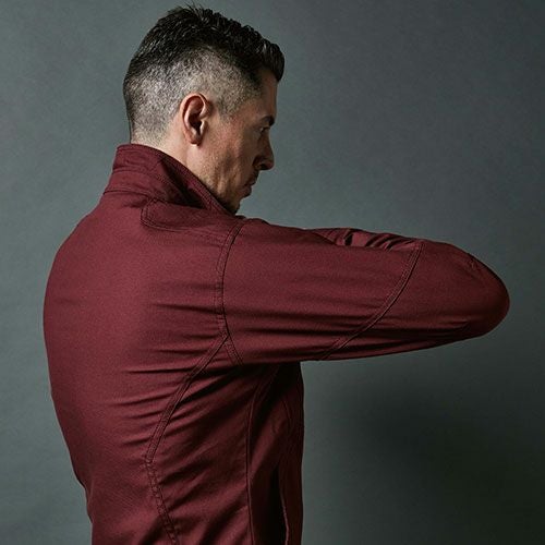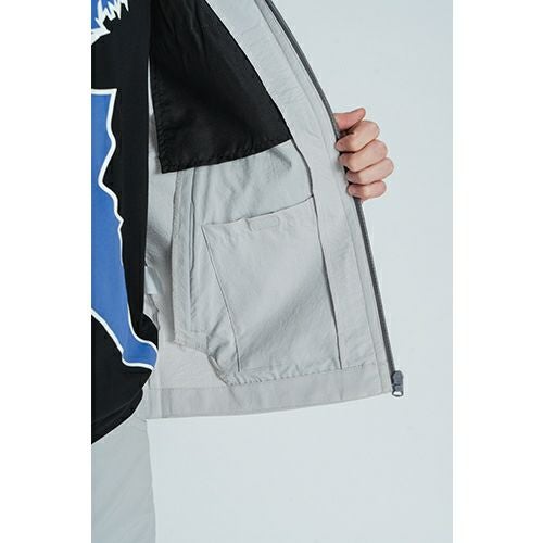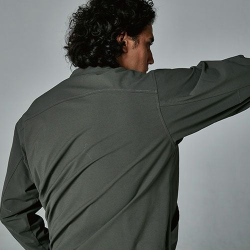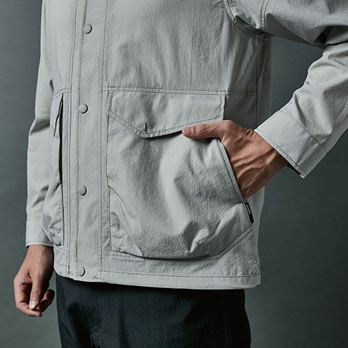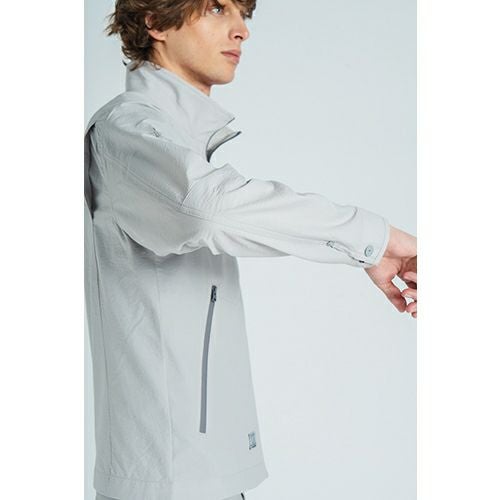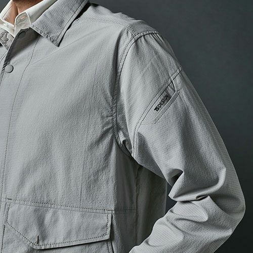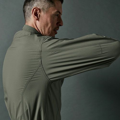 スポーツやアウトドアのテイストをミックスした新感覚のユニフォーム素材使用 ポリエステル100%ながら、高級感のあるナイロンライクな風合いを実現。生地にシワ加工を施す事により立体感を生み出し、従来のポリエステルにない高級感ある表情と肌離れの良いドライタッチを両立いたしました。