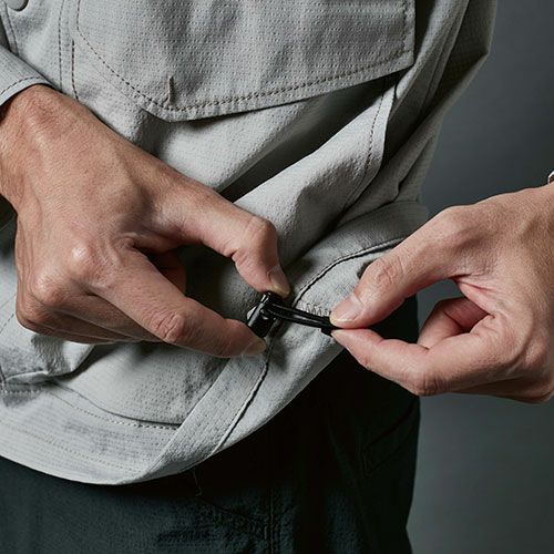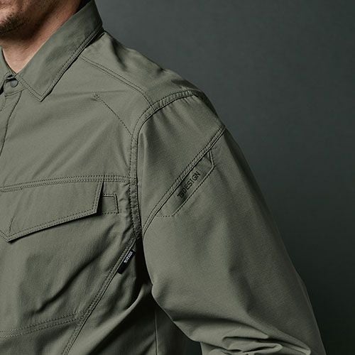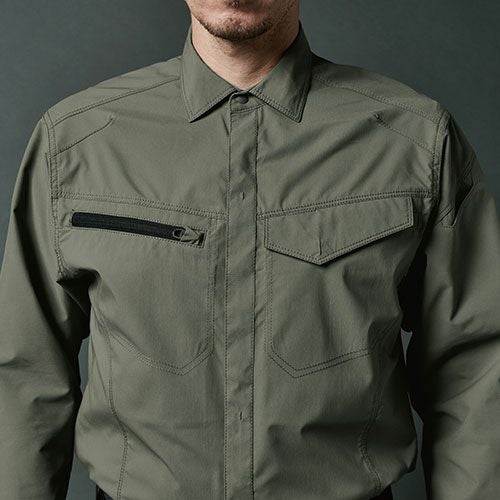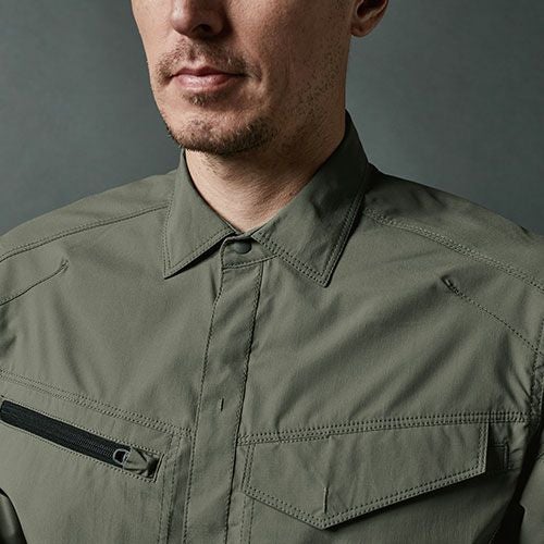綿100%素材の風合いを持つ軽量素材使用春夏シーズン特化型 綿高混率素材 TSハイブリッドコットンLTS独自開発素材。綿100%素材に最大限近付かせながらストレッチ性と軽量性を高次元で実現させている。綿100%素材よりも圧倒的な動きやすさを実現し、軽量性が高く長時間着用し続けても疲れない為、ワークシーンにおいて高いパフォーマンスを発揮する素材となっている。