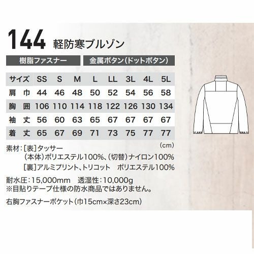 作業服 ブルゾン ジーベック 軽防寒ブルゾン 144 男女兼用 ユニセックス メンズ レディース 作業着 通年 秋冬 温かい 軽い 撥水 雨対策 防水 長袖 上着 黒 ブラック 青 ブルー 裏起毛 保温ジャケット スポーティ かっこいい 屋外作業 釣り