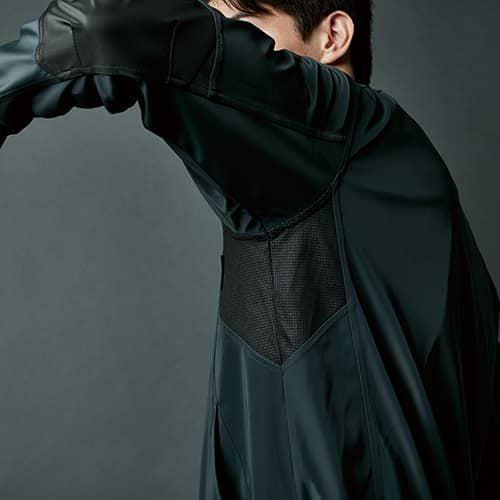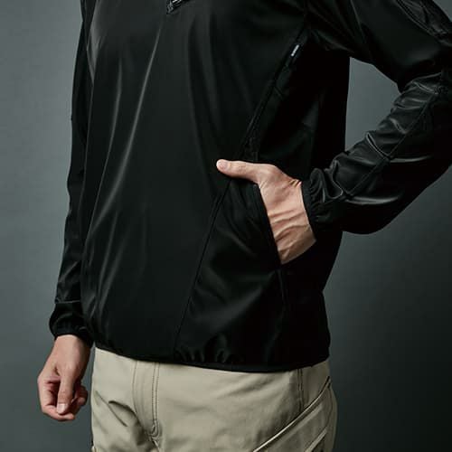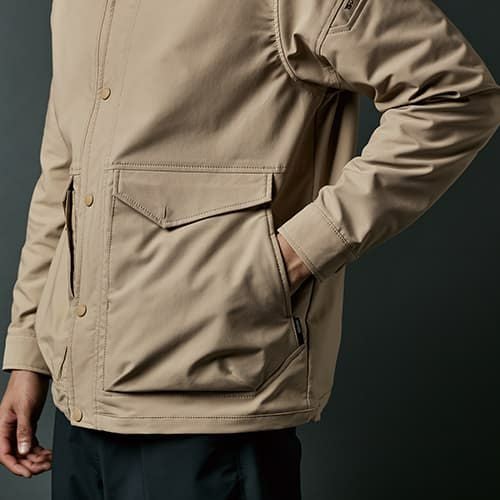マルチに活躍するカジュアル軽量撥水ウェア 生地には雨と汚れをはじく「撥水加工」、水の染みこみにくい「防水コーティング」、着心地の良さを実現する「透湿性」と、機能性抜群◎襟裏に収納可能なインフード仕様で、急な雨にも対応します。
