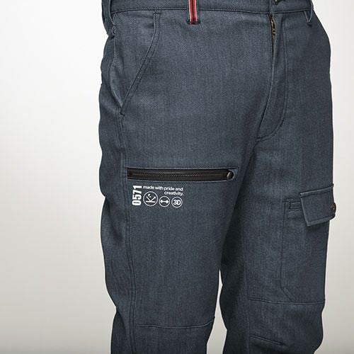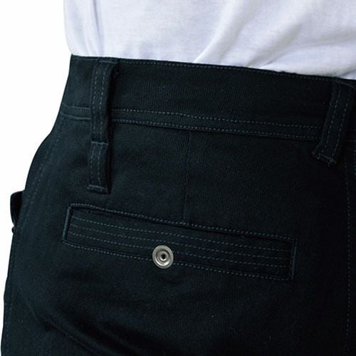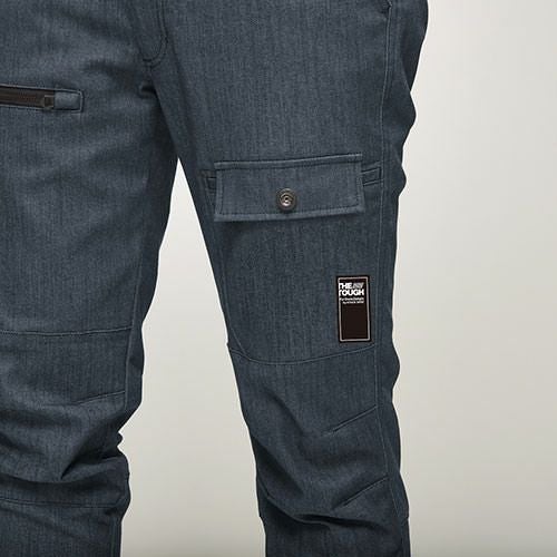 綿混の肉厚でソフトな着用感と伸縮率30%の優れたストレッチ性を両立する高機能素材。摩擦や日光による退色が少なく製造過程での環境への影響も少ない「黒原着糸」を仕様。 快適なはき心地を実現する肉厚ソフトな伸びる素材とウエストストレッチ構造のカーゴ。右足側にはエンボスファスナー装備。
