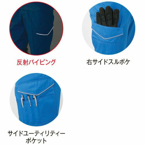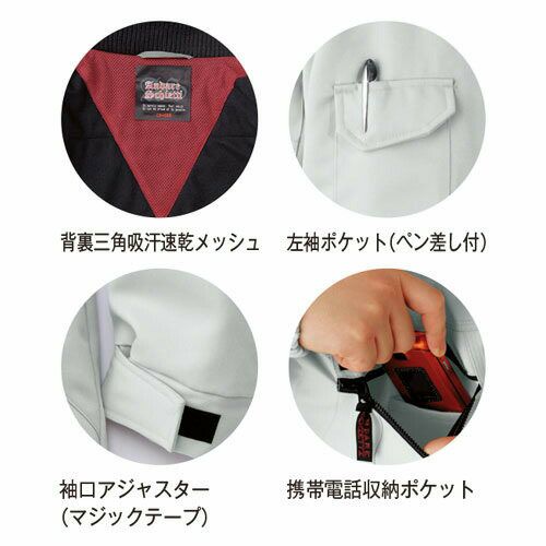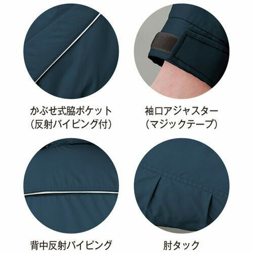 効率的に視認性を発揮!バイオモーションデザイン。 1.要所に配置した3M Scotchlite反射材で周囲からの視認性を確保し夜間作業や倉庫内作業等での車両事故リスクを軽減2.通気を妨げにくい3M「コンフォートトリム」を使用3.特殊な染色技法で上質なムラ感を表現した日本製混紡素材4.製品制電JIS T8118適合品