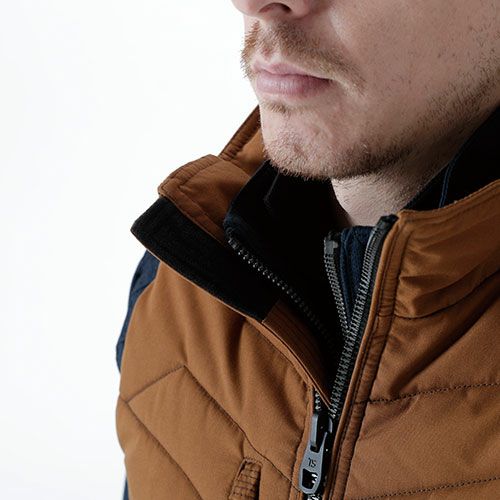 綿リッチの無重力中綿防寒 ・前ファスナーを上まで占めても首に当たりにくいグルーブネック・ポリエステル高混率なのに綿リッチ