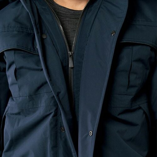 防水生地でレインウェアを着用せず作業が可能。タウンウェアとしても着用できるスタイリッシュ多用途防水防寒ウェア。 耐水圧10,000mm、透湿度1,200g/平方メートル/24hrs物流、配送、倉庫作業、工場、屋外作業やビルメン、イベント会場など防水生地でレインウェアを着用することなく作業が可能。