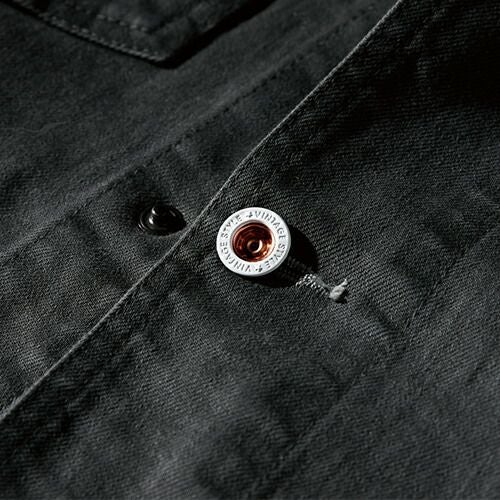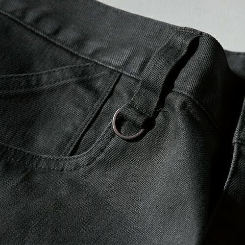 高耐久ストレッチ+デニムライクな風合い「TS LAYERED TWILL」 経糸は綿、緯糸は伸びるポリエステル糸T400をポリエステルで包み込んだ二重構造糸を使用した高品質の日本製ハイブリッド素材。これによりポリウレタンを使うことなくストレッチ性を実現させ、ポリエステル特有のギラつきを抑え素材感を出させている。経糸の綿もムラ糸を使い、デニムライクに。