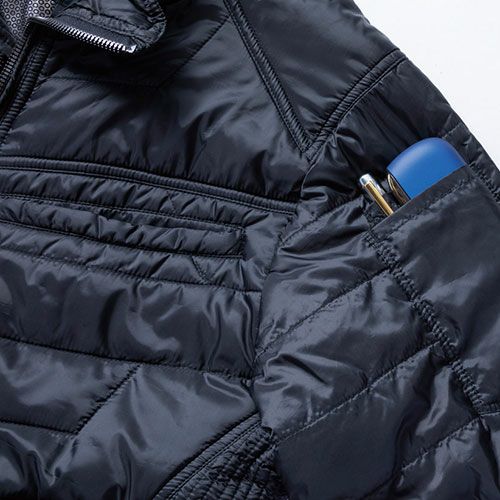 新たなバリエーション防寒半袖を追加。高い作業性、高い保温性を誇り、軽量 体温を反射し熱を逃さず暖かい裏アルミプリントとデュポン社製Soronaのシート状中わたで保温効果を備える。とても軽く薄いボリューム感で見た目のデザイン性もこだわり着ぶくれしないシルエットさらに随所に施したデザインステッチがナチュラルにオシャレさを上げる。コンパクトに丸めることもでき、持ち歩きにも便利。ほか、衿裏起毛トリコット、撥水加工仕様、ポケット袋地に制電糸を織り込んだタフタ生地採用、左胸内ポケット、刻印を施したオリジナルスライダー、補強リベットなど細かい部分にもこだわりの付加機能が充実。