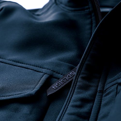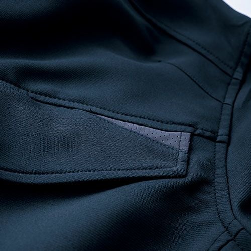 布帛の着づらさをカバーする独自開発の機能エコ素材 動きにストレスなく追従するストレッチ性、ベタつきを軽減するドライな肌触り、ポリエステルのデメリットである吸水速乾性を実現両胸フラップ、袖の切り替え、後身頃切り替え部分に反射パーツを使用し、夜間や暗がりでの視認性を高めている。