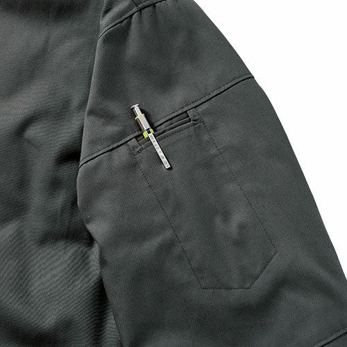 上下ともに非対称なポケットデザインの お洒落作業服 左胸ポケットのスリットに反射材を配したお洒落な作業服に、脇下のXEカットと背中のプリーツロンが連動して滑らかな動きをサポートするスムーズアップ機能を装着。お洒落さと動きやすさで、土木・建築から運送・工場と幅広い職場に対応します。