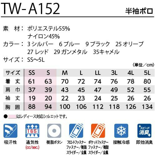 他の画像を見る 作業服 ポロシャツ 半袖 タカヤ商事 TAKAYA 半袖ポロ TW-A152 作業着 春夏作業着 作業服 ポロシャツ 春夏 特別価格 ¥ 4,620 税込 〜 特別価格 ¥ 税込 驚異的なスピード消臭能力を持つ「クリーンメル」を使用したハイテクワークポロが新登場。ナイロンミックスによる冷却効果や高通気性など夏場のワークを爽快にする機能も満載。洗練された配色ポジションや顔立ちをスッキリみせる襟先デザインなど細部までこだわった秀逸のカットソーアイテム。 1.科学の力でアンモニア臭などをスピード消臭&効き目長持ち2.吸水速乾機能でサラッと快適3.ナイロンミックスによるひんやり接触冷感4.高い通気性(通気度:165cc/sec)5.豊富なカラー展開で多彩なコーディネートが可能6.レディース対応も充実、ダイバーシティモデル化学の力で即効消臭!即効性・消臭性・洗濯耐久性に優れています。■即効性:消臭成分が立体的になっているので、接触効率が良く、アンモニア・アミン臭などを素早く消臭します。■洗濯耐久性:化学反応により繊維の分子と結合しているので、洗濯により、消臭機能が欠落することがほとんどありません。■消臭力:消臭成分を多く結合することでニオイを吸着する容量を大きくすることができます。また、温度などに影響されずニオイの再放出がありません。■選択消臭:香水やアロマの良い香りは残しながら、アンモニアなどの生活の気になるニオイだけを軽減します。 詳細を見る お気に入りに登録する
