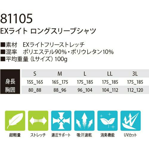 他の画像を見る 藤和 TS Design EXライト ロングスリーブシャツ 長袖インナー 81105 夏用 涼しい 暑さ対策 クール 2020年春夏新作 超軽量 ストレッチ コンプレッション 吸汗速乾 消臭 UVカット メンズ アンダーシャツ 特別価格 ¥ 1,860 税込 〜 特別価格 ¥ 税込 TS独自開発の最極細糸を使用した最薄素材・最軽量インナー。 あらゆる動きに対応するフリーストレッチ、軽量の無重力インナーです。 詳細を見る お気に入りに登録する