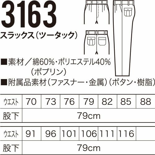 他の画像を見る クロダルマ 3163 スラックス(ツータック) 作業着 ボトムス ワークウエア ワークウェア 作業服(春夏) パンツ・スラックス 腿ポケット無ズボン 作業服 特別価格 ¥ 5,422 税込 〜 特別価格 ¥ 税込 詳細を見る お気に入りに登録する
