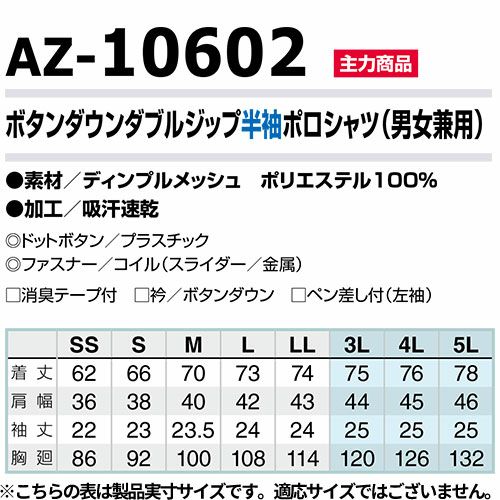 他の画像を見る アイトス AZ-10602 ボタンダウンダブルジップ半袖ポロシャツ(男女兼用) AITOZ 作業服 作業着 ポロシャツ シャツ 半袖 春夏 メンズ レディース 男女兼用 ワークウェア 吸汗 速乾 消臭 涼しい 特別価格 ¥ 3,289 税込 〜 特別価格 ¥ 税込 吸汗速乾素材を使用したダブルジップポロシャツ。 詳細を見る お気に入りに登録する