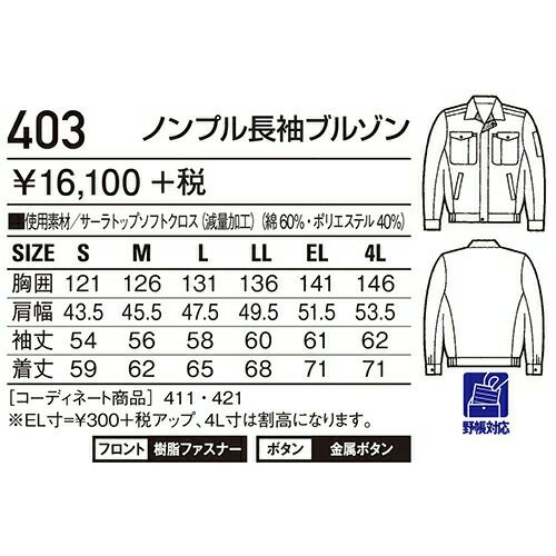 他の画像を見る 自重堂 DESK-WJ 作業服 403 長袖ブルゾン 春夏 メンズ 作業着 ワークウエア ブルゾン 特別価格 ¥ 10,527 税込 〜 特別価格 ¥ 税込 「ノンプル」仕様が腕のつっぱり感を解消。 素材感、着心地ともハイクオリティを追求したひとクラス上のユニフォーム。 上質なインド綿ならではのナチュラルでしなやかなドレープ性と「ノンプル」の優れた運動性が好評のロングセラー商品。 詳細を見る お気に入りに登録する