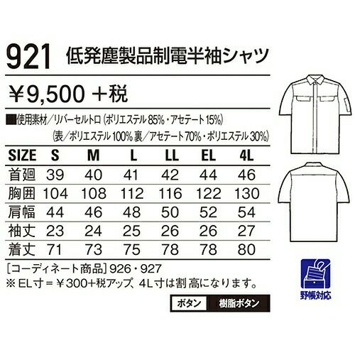 他の画像を見る 自重堂 DESK 作業服 921 半袖シャツ 春夏 メンズ 作業着 半袖 ワークウエア ワークシャツ 特別価格 ¥ 6,050 税込 〜 特別価格 ¥ 税込 チリやホコリを嫌う職場に低発塵ユニフォーム。 低発塵性と肌触りの良さを追求した二重織り素材「リバーセル」を使用。 毛羽が発生しにくいポリエステル長繊維を使用することで低発塵性に優れ、 またウォッシュ&ケアにも富んでいます。 詳細を見る お気に入りに登録する