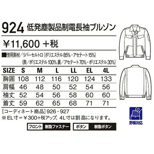 他の画像を見る 自重堂 DESK 作業服 924 長袖ブルゾン 春夏 メンズ 作業着 ワークウエア ブルゾン 特別価格 ¥ 7,260 税込 〜 特別価格 ¥ 税込 チリやホコリを嫌う職場に低発塵ユニフォーム。 低発塵性と肌触りの良さを追求した二重織り素材「リバーセル」を使用。 毛羽が発生しにくいポリエステル長繊維を使用することで低発塵性に優れ、 またウォッシュ&ケアにも富んでいます。 詳細を見る お気に入りに登録する