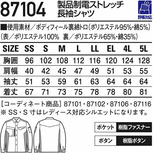 他の画像を見る 作業服 長袖シャツ 自重堂 Field Message 製品制電ストレッチ長袖シャツ 87104 作業着 春夏 メンズ レディース ペアユニフォーム 人気 上下セット対応 制服 企業ユニフォーム 工場 研究 動きやすい 伸縮 静電気 埃 防汚 汚れにくい 落ちやすい 特別価格 ¥ 4,279 税込 〜 特別価格 ¥ 税込 東レ テクノクリーン使用!「汚れがつきにくい」と「汚れを落としやすい」を両立した防汚加工 ストレッチと製品制電もプラスし機能充実の男女ペアユニフォーム 詳細を見る お気に入りに登録する