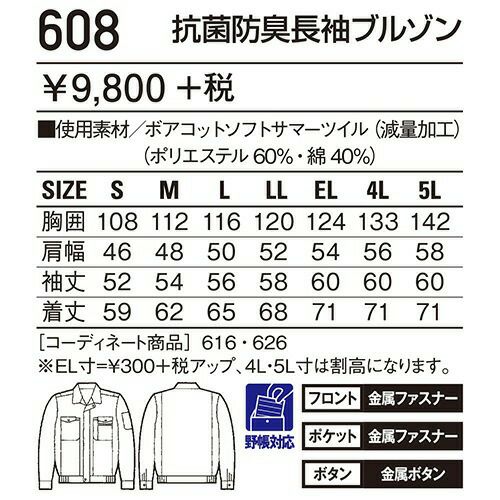 他の画像を見る 自重堂 DESK 作業服 608 長袖ブルゾン 春夏 メンズ 作業着 ワークウエア ブルゾン 特別価格 ¥ 6,292 税込 〜 特別価格 ¥ 税込 人気を独占し続ける、支持率ナンバーワンのベストセラー。 すべてのワーカーが惚れ込んだ、ワーキングデザインの基本形とも呼べるシリーズです。耐久性とソフトな着心地を両立させた価値ある一着です。 詳細を見る お気に入りに登録する