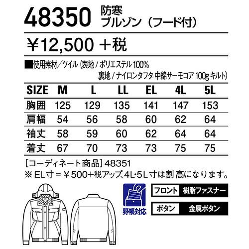 他の画像を見る 自重堂 ブルゾン(フード付) 防寒ジャケット ドカジャン 保温 人気 安い ダウン 防寒着 防寒ジャンパー 上着 ブルゾン 最強 アウター おしゃれ 暖かい 秋冬 かっこいい 作業着 ワーク マン メンズ 寒さ対策 屋内作業 屋外作業 あったか 防寒グッズ 48380 特別価格 ¥ 16,841 税込 〜 特別価格 ¥ 税込 耐水圧10,000 mm+ シンサレートウルトラ使用のハイブリッドエコ防水防寒。 軽量ながら十分な温かさをキープしたエコ防水防寒。中綿にシンサレートウルトラを使用。 詳細を見る お気に入りに登録する