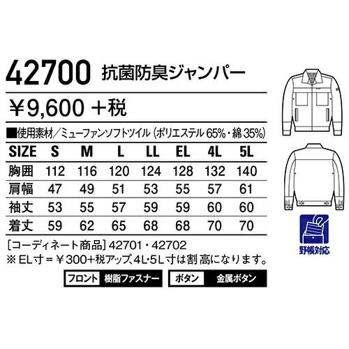 他の画像を見る 自重堂 Field Message 作業服 43500 ブルゾン 秋冬 メンズ 作業着 ワークウエア 通年 上着 おしゃれ かっこいい 人気 企業 法人 ワーク 作業 工場 外作業 ワークユニフォーム 仕事 土木 工事 現場 特別価格 ¥ 6,061 税込 〜 特別価格 ¥ 税込 銀を纏いスタイリッシュに着こなす。 裏綿に純銀糸「ミューファン」を使用。温かくふんわりとした着心地です。 詳細を見る お気に入りに登録する
