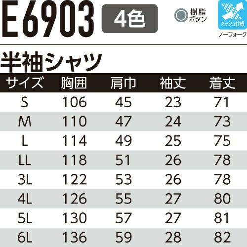 他の画像を見る 作業服 半袖シャツ Asahicho 旭蝶繊維 半袖シャツ E6903 作業着 春夏作業着 作業服 半袖 春夏 特別価格 ¥ 4,070 税込 〜 特別価格 ¥ 税込 ソフト加工×光触媒防汚加工 セーフティウェア(E7902シリーズ 反射材付き)とコーディネート可能です。 詳細を見る お気に入りに登録する