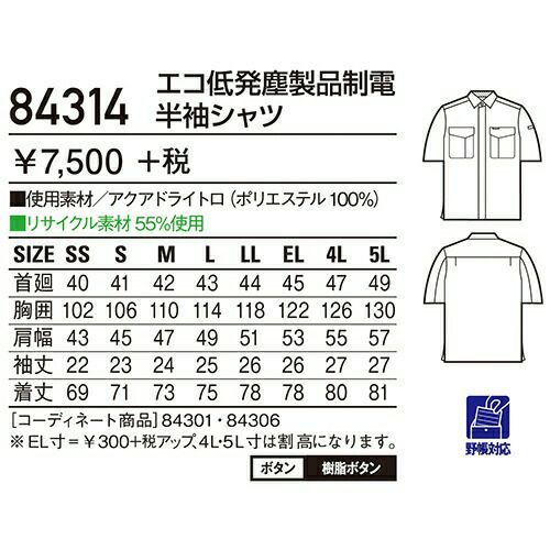 他の画像を見る 自重堂 作業服 84114 半袖シャツ 春夏 ユニセックス 作業着 半袖 ワークウエア ワークシャツ 特別価格 ¥ 4,543 税込 〜 特別価格 ¥ 税込 「3つの価値」(再生ポリエステル使用のエコ素材・分子レベルの防汚加工・製品制電)を 併せ持つ機能充実のワークウエア。 落ちにくい汚れがつきにくいだけでなく、付いた汚れも家庭洗濯で簡単に洗い落とせ 再汚染もしにくい分子レベルのナノ加工を施した高性能な素材です。 詳細を見る お気に入りに登録する