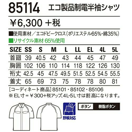 他の画像を見る 自重堂 作業服 85114 半袖シャツ 春夏 ユニセックス 作業着 半袖 ワークウエア ワークシャツ 特別価格 ¥ 3,927 税込 〜 特別価格 ¥ 税込 突起物の露出をなくした多機能ペアユニフォーム。 ファスナーやボタン、ベルトのバックルなどの突起物による事故を 未然に防げるようにデザインされたシリーズです。 詳細を見る お気に入りに登録する