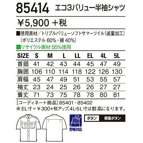 他の画像を見る 自重堂 作業服 85414 半袖シャツ 春夏 メンズ 作業着 半袖 ワークウエア ワークシャツ 特別価格 ¥ 4,070 税込 〜 特別価格 ¥ 税込 オーソドックスでどこか凛々しい、3つの機能を持つユニフォーム。 エコ、製品制電、防汚加工の高機能ウエアをリーズナブルに。 詳細を見る お気に入りに登録する