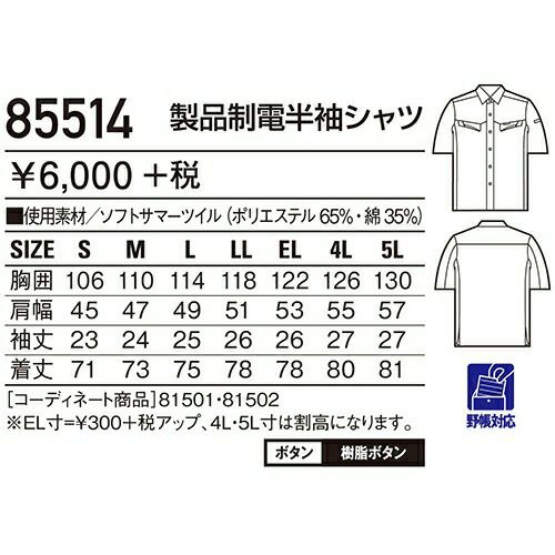 他の画像を見る 自重堂 作業服 85514 半袖シャツ 春夏 メンズ 作業着 半袖 ワークウエア ワークシャツ 特別価格 ¥ 4,521 税込 〜 特別価格 ¥ 税込 新鮮さが持続する。洗濯耐久性に優れた一着。 織物芯を使用することで型くずれを防止し、生地に色あせ防止加工をしていますので洗濯を繰り返しても新鮮さが持続します。 詳細を見る お気に入りに登録する