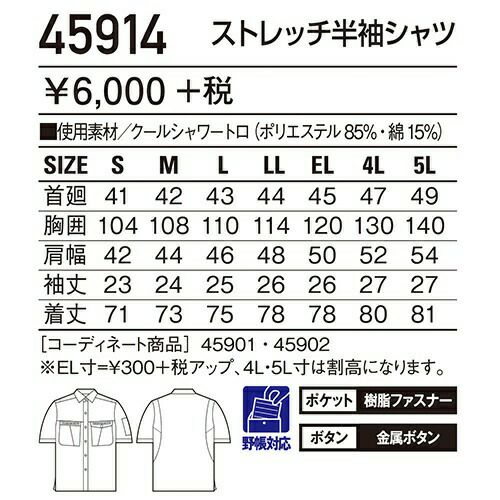 他の画像を見る 自重堂 作業服 45914 半袖シャツ 春夏 メンズ 作業着 半袖 ワークウエア ワークシャツ 特別価格 ¥ 3,828 税込 〜 特別価格 ¥ 税込 素材にこだわった機能性抜群のベストセラー。 「動きやすいウエアを」という声に応え、ストレッチ素材「クールシャワー」、ウイングアームを採用し機能性を大幅アップ。通気性、防シワ性にも優れ夏場の快適ワークをサポートします。 詳細を見る お気に入りに登録する