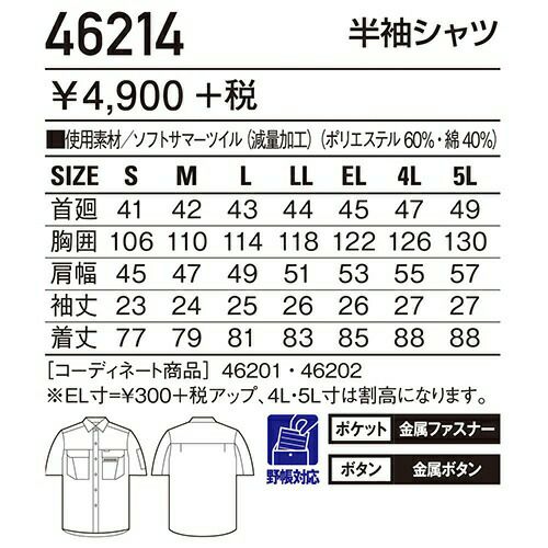 他の画像を見る 自重堂 作業服 46214 半袖シャツ 春夏 メンズ 作業着 半袖 ワークウエア ワークシャツ 特別価格 ¥ 3,201 税込 〜 特別価格 ¥ 税込 タフさを追求したハードワーカーの新定番。 忙しく動き回るオンタイムをバックアップするデザイン。 様々な機能をシンプルにまとめあげたシリーズです。 詳細を見る お気に入りに登録する