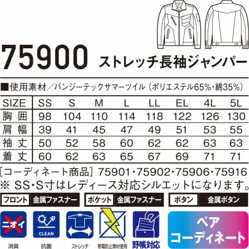 他の画像を見る 作業服 ジャンパー 自重堂 Z-DRAGON ストレッチ長袖ジャンパー 75900 作業着 春夏 メンズ レディース 人気 上下セット対応 制服 企業ユニフォーム 工事 土木 塗装 工場 電気工事 土建 建設 建築 設備 動きやすい 伸縮性 ペアユニフォーム 特別価格 ¥ 4,411 税込 〜 特別価格 ¥ 税込 丈夫で伸縮性に優れたストレッチT/C素材 あらゆる現場に対応するストレッチカジュアルワークウエア 詳細を見る お気に入りに登録する
