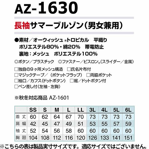 他の画像を見る アイトス AZ-1630 長袖サマーブルゾン AITOZ 作業服 作業着 ワークウエア ジャケット アウター 春夏 メンズ レディース 男女兼用 ワークウェア 帯電防止 特別価格 ¥ 5,670 税込 〜 特別価格 ¥ 税込 通気性に優れた素材東レの「オーウィッシュトロピカル」を生地に採用 詳細を見る お気に入りに登録する