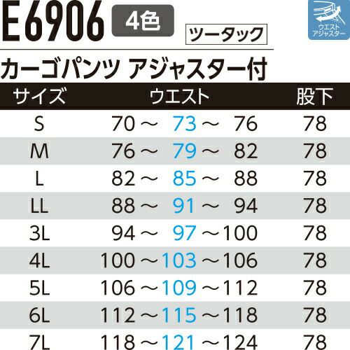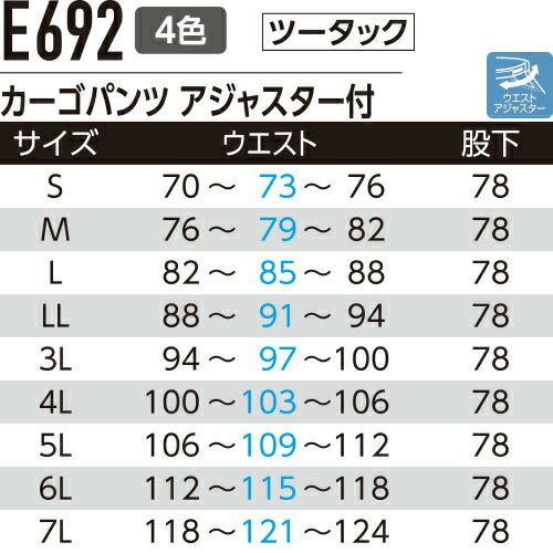 他の画像を見る 作業服 カーゴパンツ Asahicho 旭蝶繊維 カーゴパンツ アジャスター付き(ツータック) E6906 作業着 春夏作業着 作業服 カーゴパンツ 春夏 特別価格 ¥ 4,829 税込 〜 特別価格 ¥ 税込 ソフト加工×光触媒防汚加工 セーフティウェア(E7902シリーズ 反射材付き)とコーディネート可能です。 詳細を見る お気に入りに登録する