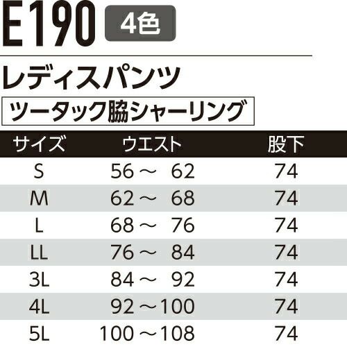 他の画像を見る 作業服 レディース パンツ Asahicho 旭蝶繊維 レディスパンツ(ツータック脇シャーリング) E190 作業着 通年 秋冬作業着 作業服 レディースパンツ 特別価格 ¥ 3,927 税込 〜 特別価格 ¥ 税込 環境に優しくJIS適合帯電防止素材 ポケットレスウェア(E141シリーズ)とコーディネートが可能です。 詳細を見る お気に入りに登録する