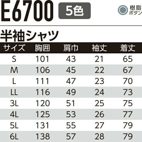 他の画像を見る 作業服 半袖シャツ Asahicho 旭蝶繊維 半袖シャツ E6903 作業着 春夏作業着 作業服 半袖 春夏 特別価格 ¥ 4,070 税込 〜 特別価格 ¥ 税込 ソフト加工×光触媒防汚加工 セーフティウェア(E7902シリーズ 反射材付き)とコーディネート可能です。 詳細を見る お気に入りに登録する