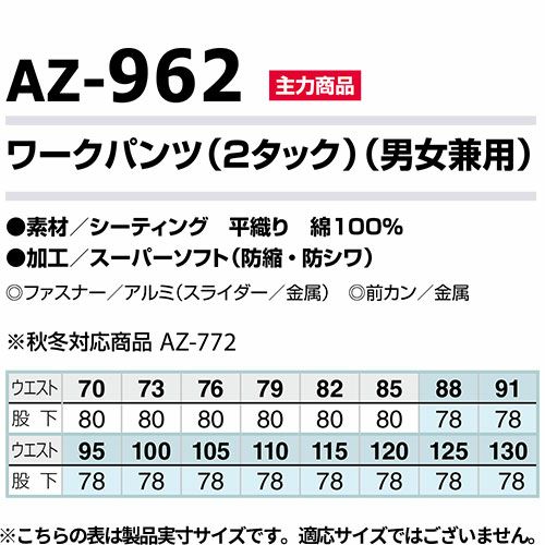 他の画像を見る アイトス AZ-962 ワークパンツ(2タック ツータック) AITOZ 作業服 作業着 腿ポケット無 ボトムス スラックス パンツ ズボン メンズ レディース 男女兼用 春夏 ワークパンツ 形態安定 吸汗 特別価格 ¥ 3,660 税込 〜 特別価格 ¥ 税込 綿100%のやさしい肌ざわり。すぐれた吸汗性と耐久性で快適なワークシーンを演出。 詳細を見る お気に入りに登録する
