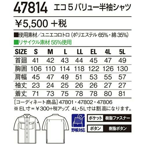 他の画像を見る 自重堂 作業服 47814 半袖シャツ 春夏 ユニセックス メンズ・レディース対応 作業着 半袖 ワークシャツ 特別価格 ¥ 3,696 税込 〜 特別価格 ¥ 税込 多機能ペアユニフォームでどんなニーズにも対応。 吸汗速乾加工を施し、ストレッチ機能を付加したエコ素材。 様々なニーズに対応したユニフォームです。 詳細を見る お気に入りに登録する