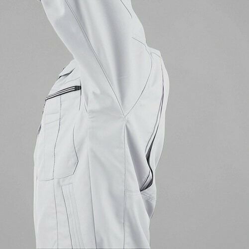 吸汗性・速乾性に優れたオリジナル二層構造素材を使用し、胸ファスナーのシャープなデザインにまとめ、快適性にクールデザインを融合させた力強く、かつスタイリッシュなワークスタイルです。