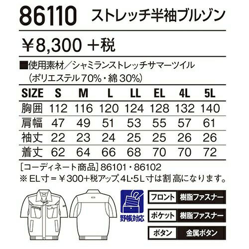 他の画像を見る 自重堂 作業服 86110 半袖ブルゾン 春夏 メンズ 作業着 ワークウエア ブルゾン 特別価格 ¥ 5,258 税込 〜 特別価格 ¥ 税込 ストレッチ素材で動きやすさを向上させたクールビズ対応ユニフォーム。 メッシュを多用することで通気性抜群。シンプルなでデザインとストレッチ性で着る人を選ばない快適ユニフォーム。 詳細を見る お気に入りに登録する