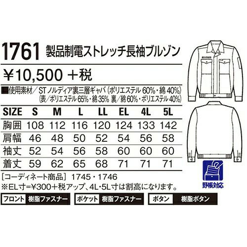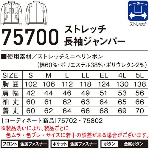 他の画像を見る 作業服 ジャンパー 自重堂 Z-DRAGON ストレッチ長袖ジャンパー 75900 作業着 春夏 メンズ レディース 人気 上下セット対応 制服 企業ユニフォーム 工事 土木 塗装 工場 電気工事 土建 建設 建築 設備 動きやすい 伸縮性 ペアユニフォーム 特別価格 ¥ 4,411 税込 〜 特別価格 ¥ 税込 丈夫で伸縮性に優れたストレッチT/C素材 あらゆる現場に対応するストレッチカジュアルワークウエア 詳細を見る お気に入りに登録する