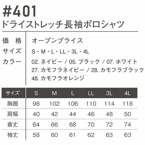 他の画像を見る アイズフロンティア ポロシャツ 長袖 ドライストレッチ長袖ポロシャツ #401 作業服 作業着 春夏 I'Z FRONTIER ストレッチ ドライ 鹿の子 吸水速乾 抗菌防臭 胸ポケット付 カジュアル スポーツ アウトドア カッコいい 特別価格 ¥ 1,570 税込 アイズ殿堂的ポロシャツ素材が新感覚のルックスをまとい登場。ニューベーシックの歩みがここから始まる。 ・様々なシーンに映える鹿の子編み素材にポリウレタン糸を配合。伸長率タテ約22%・ヨコ約59%、伸長回復率(1時間後)タテ約93%・ヨコ約95%を誇る抜群のストレッチ性能を発揮し快適な着心地を実現します。・爽やかでしなやかな風合いもハイレベルな破裂強度(753kPa)、抗ピリング性(5級)、抗スナッグ性(4.5級)等抜群の強度を併せ持つ完成度の高い1着に仕上がっています。・吸水速乾加工、抗菌防臭加工をそれぞれ施し、不快なベタつきや嫌な臭いを軽減。更なる快適性を追求しています。・胸ポケットは内側にペン挿し機能を搭載した万能タイプ。・台衿仕様でシャープなスタイリングが可能。衿を立てれば首の日焼けを軽減致します。・シーンを選ばず着用可能なシンプルモデルとアクティブな個性を発揮する迷彩プリントモデルの2タイプをラインナップ。大胆なロゴプリントが高級感を高めます。 詳細を見る お気に入りに登録する
