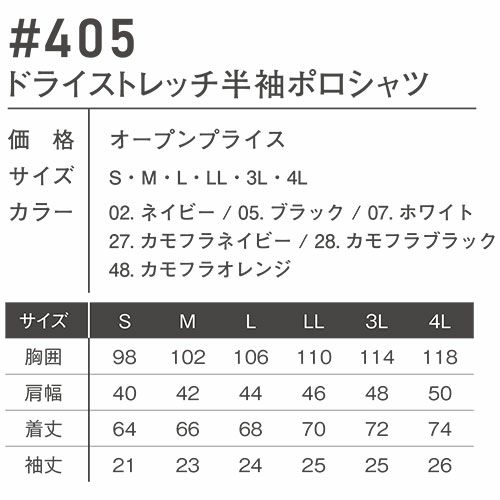 他の画像を見る アイズフロンティア ポロシャツ 半袖 ドライストレッチ半袖ポロシャツ #405 作業服 作業着 春夏 I'Z FRONTIER ストレッチ ドライ 鹿の子 吸水速乾 抗菌防臭 胸ポケット付 カジュアル スポーツ アウトドア カッコいい 特別価格 ¥ 1,570 税込 アイズ殿堂的ポロシャツ素材が新感覚のルックスをまとい登場。ニューベーシックの歩みがここから始まる。 ・様々なシーンに映える鹿の子編み素材にポリウレタン糸を配合。伸長率タテ約22%・ヨコ約59%、伸長回復率(1時間後)タテ約93%・ヨコ約95%を誇る抜群のストレッチ性能を発揮し快適な着心地を実現します。・爽やかでしなやかな風合いもハイレベルな破裂強度(753kPa)、抗ピリング性(5級)、抗スナッグ性(4.5級)等抜群の強度を併せ持つ完成度の高い1着に仕上がっています。・吸水速乾加工、抗菌防臭加工をそれぞれ施し、不快なベタつきや嫌な臭いを軽減。更なる快適性を追求しています。・胸ポケットは内側にペン挿し機能を搭載した万能タイプ。・台衿仕様でシャープなスタイリングが可能。衿を立てれば首の日焼けを軽減致します。・シーンを選ばず着用可能なシンプルモデルとアクティブな個性を発揮する迷彩プリントモデルの2タイプをラインナップ。大胆なロゴプリントが高級感を高めます。 詳細を見る お気に入りに登録する