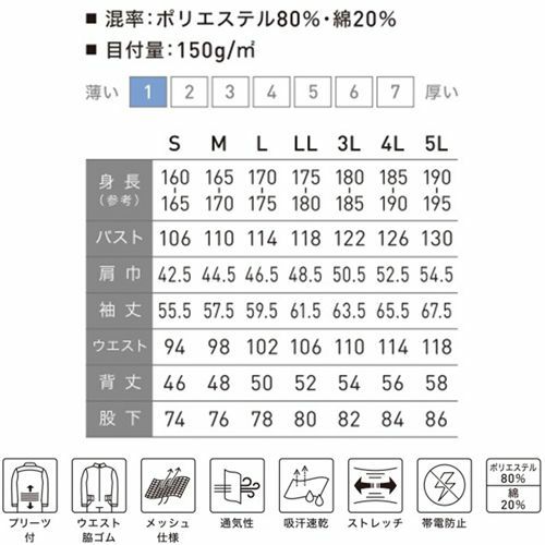 他の画像を見る 作業服 ブルゾン クロダルマ 長袖ジャンパー 256801 作業着 春夏 リサイクル繊維 ストレッチ 軽量 男女兼用 静電気帯電防止 特別価格 ¥ 6,040 税込 〜 特別価格 ¥ 税込 SDGsに貢献するリサイクル繊維採用 静電気帯電による事故防止のためJIS規格もクリア軽量で縦にも横にも伸びるストレス素材ストレスフリーの男女兼用ユニセックス作業服です。 詳細を見る お気に入りに登録する