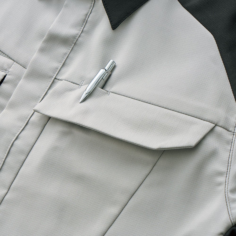上下ともに非対称なポケットデザインの お洒落作業服 左胸ポケットのスリットに反射材を配したお洒落な作業服に、脇下のXEカットと背中のプリーツロンが連動して滑らかな動きをサポートするスムーズアップ機能を装着。お洒落さと動きやすさで、土木・建築から運送・工場と幅広い職場に対応します。