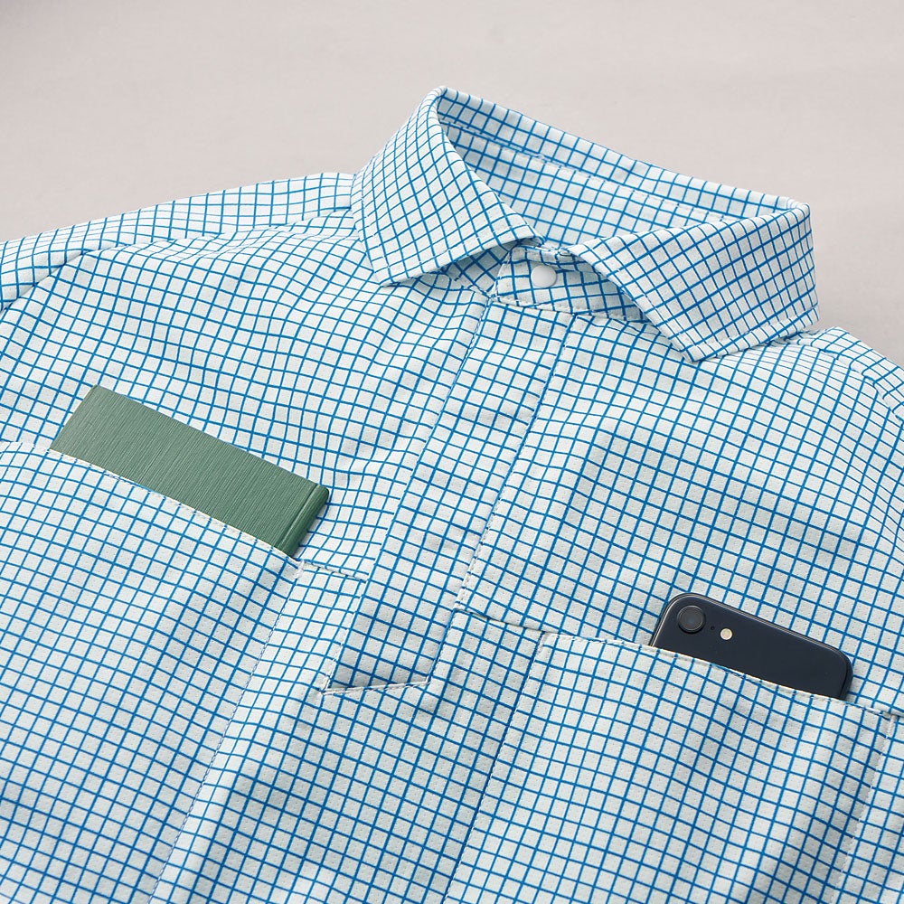 落ち着いた格子柄のデザインが清潔感を演出軽くて通気性やストレッチ性に優れた制電糸入り快適素材採用の半袖ポロシャツ